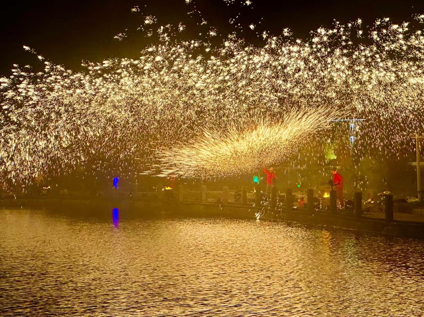 在盐湖景区,传统非遗“打铁花”与无人机表演相结合,也为游客提供了多样的夜间活动选择。当温度约1600℃的铁水被泼向空中时,形成特定视觉效果,随后无人机在夜空中组成“我爱你中国”等图案。这种传统与现代结合的表演形式,丰富了当地的夜间旅游内容。